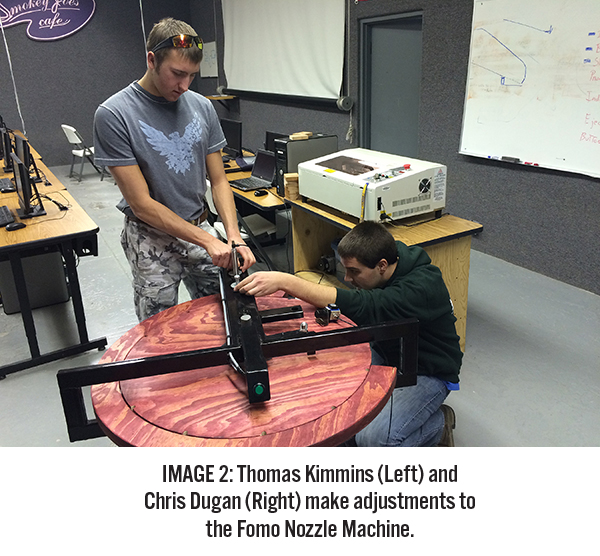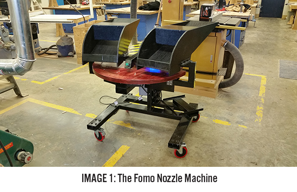 Using SolidWorks, the team generated a design and made machine sketches, then began building and testing individual parts. The newly designed Fomo Nozzle assembly machine was constructed of a slotted plywood center wheel and outside path with a cold rolled steel wheel center and axle, and steel tubing wheel frame. The indexer and plunger mechanism consisted of pneumatic cylinders and custom metal parts. Three removable plywood parts hoppers were constructed to contain the nozzle, mixer and completed assembly. Casters were also added to make the machine easily portable. The entire process is controlled by Arduino computer code written by senior Bobby Wagner.