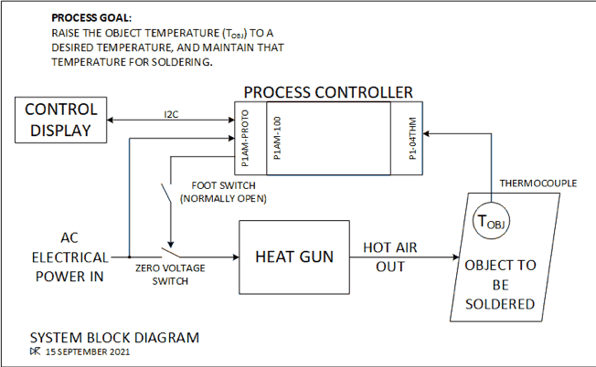 The sample project is based on a soldering station, which needs to control a 1500 watt hot-air heat gun to blow through a tabletop grid and maintain temperature so transistors can be soldered to a copper heat spreader. A ProductivityOpen controller would be used to operate the heat gun and maintain a stable temperature. Thermal processes are typically slow to respond, so this is a good challenge for a PID control scheme.