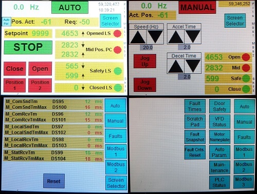 The door keeps traditional limit switches, but Thiel added a proximity switch and a sprocket to act as a durable encoder, enabling the PLC to track door travel distance with a repeatability better than ±0.25 inch. The HMI displays door status, control buttons, user settings, and detailed I/O and communications diagnostics. He created advanced operations like: