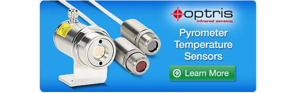 Optris CSmicro LTH, 3ML/3MH, and 2MH series miniature infrared pyrometers feature a rugged stainless steel construction and provide additional temperature ranges up to 1600°C (2912°F) with new wavelengths that can measure temperatures through glass or can measure metal and shiny surfaces.