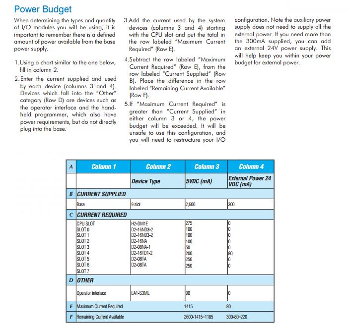 Now before we touch on the brain of the system, I’d like to detour a bit and discuss the Power Supply. As mentioned earlier, the PLC power supply can be included with the base or it can be a separate unit. They come in a variety of voltage ranges, including 12-24VDC and 110/220 VAC, and supply a limited amount of amperage. It is very important that the power supply chosen is capable of supplying the CPU and I/O modules with the power they need. To ensure this, perform a power budget analysis and calculate the current required for all powered PLC hardware used in your application. An example is shown below.