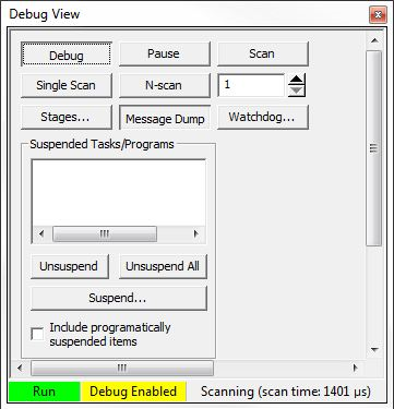 Debugging tools assist with locating and repairing bugs in your code by allowing you to slowly step through the execution of your logic. Step from one rung to the next, execute multiple rungs, run one complete scan or pause the execution all together. Some debugging tools also allow you to suspend selected tasks or routines and force watchdog errors.