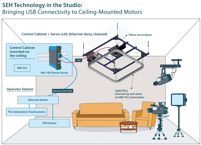 Showman Fabricators is a studio set designer/builder and needed a solution to configure and control 20 individual ceiling-mounted integrated servo motors, used to hoist scenic elements like large light rings to specified elevations. They took advantage of the latest developments in IP-enabled motion and programmable logic controller (PLC) technology to make this possible.