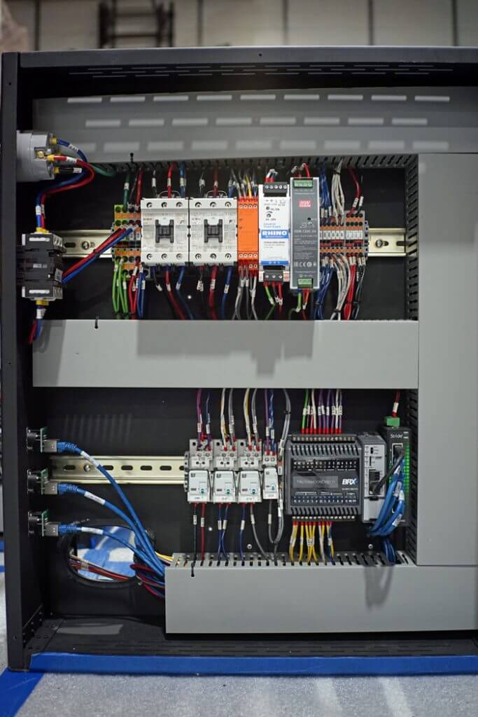 Each cabinet effectively has two IP addresses: one is the USB device server targeted by a PC with the servo configuration software, and the other is the AutomationDirect BRX PLC accessed by a human machine interface (HMI) touchscreen for motor control. All cabinets are linked in a linear fashion with wired Ethernet.