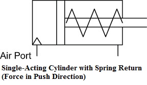 Single acting spring return cylinders have one air connection port to extend the cylinder rod and provide power in the “push” direction. An internal spring retracts the cylinder rod in the “pull” direction. With only a spring (no air pressure) to retract the cylinder rod, very little power is available in the “pull” direction. Single acting cylinders use about one-half as much air as double acting cylinders and are operated by 3-way valves. (Figure 1)