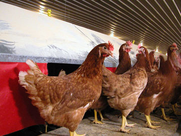A cage-free environment allows the hens to roam freely inside the barn. When they are ready to lay their eggs, the hens climb into red nesting boxes, which tilt back slightly. As each egg is layed, it gently rolls out of the nest and travels on a series of conveyor belts that transport it to the processing facility.