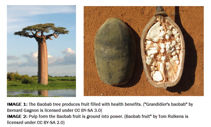 The Baobab tree is known as the tree of life, and it produces a fruit about the size of a large coconut, with a velvety shell. The pulp inside the pods is very high in vitamin C, dietary fiber (up to 50% by weight), and thiamin. (Image 2) The powdered pulp is added to shakes and used as a sweetener for other fruit drinks, and can also be used as a thickener for jams and other foods.