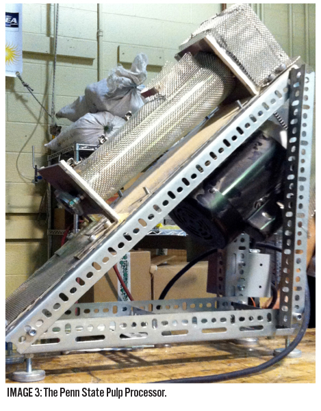 The Penn State Pulp Processor uses an AutomationDirect IronHorse® AC motor attached via chain to drive a cylindrical stainless steel “heart” which has grooves machined in its surface. It is surrounded by a mesh that helps grind the pulp into a very fine powder and separates the seeds. (Image 3) “One of the neat things about the IronHorse motor is that, in addition to being quite rugged, it can be wired to either the 110V used here in the United States or the 220V used in Africa,” reports Andrew “Mike” Erdman, the Director of Engineering Leadership Development program and an Instructor in the Engineering Science and Mechanics department at Penn State.