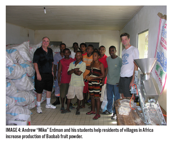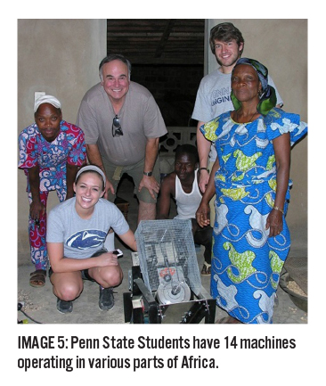 Excluding the earlier prototypes which were not as functional, the students have produced about fourteen machines which are now operating in various African countries. Mike estimates that the machines can process a kilo of powder in under three minutes. (Image 4) That’s less than 5-10% of the time required by the manual process, and because the mechanical processor only contacts the pulp with stainless steel components the process is much cleaner, and the resulting powder is much more pure than is produced by the manual method.