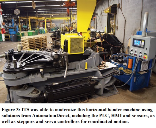 “If a job calls for, say, making 90 degree elbows with a 60 inch radius from 2 inch galvanized rigid conduit, there is no standard shoe for that. So this machine is used to make small quantities of non-standard products,” explains Engle. Instead of sticking with the cumbersome old process, the manufacturer asked ITS to modernize the control system with an HMI, PLC and sensors from AutomationDirect. (Figure 3)