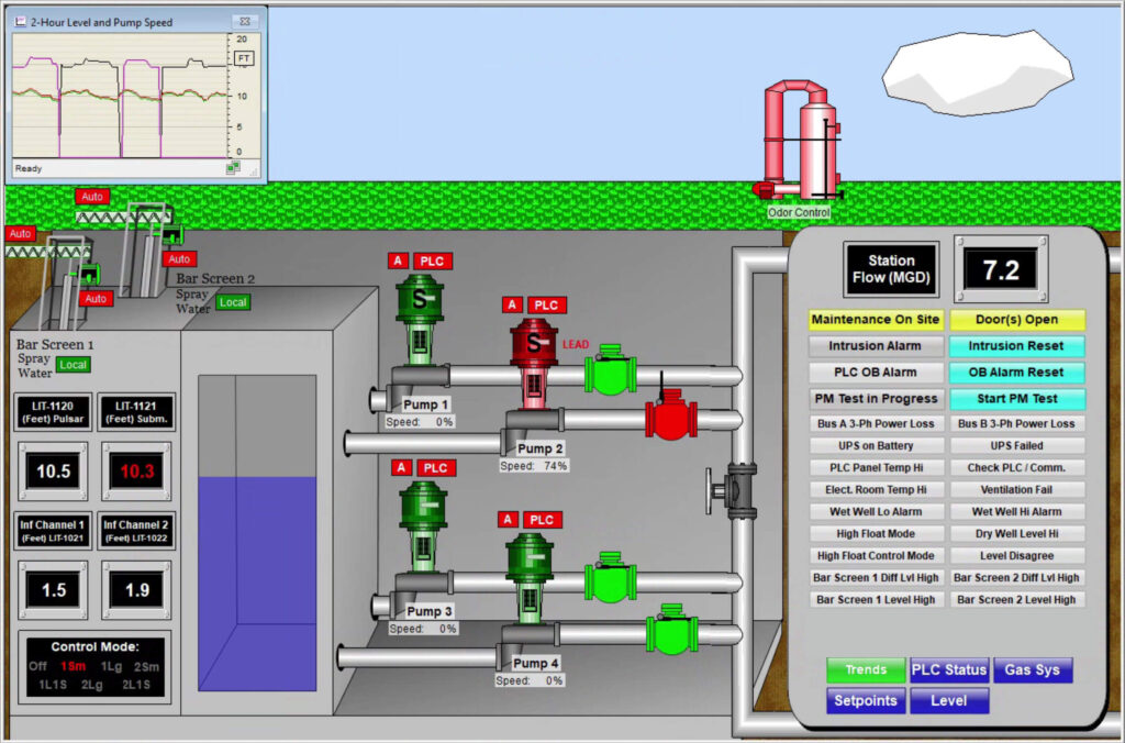 While redundant PLCs are available, for smaller systems like the wet well it may be more appropriate to add some basic hardwired controls, such as a high-low level controller, in parallel with a PLC. If the PLC or VFD fails, this type of controller can use bypass contactors to run the pump in a simple on/off manner.