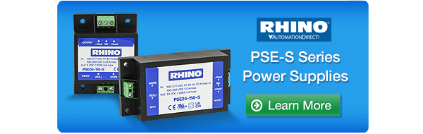 September 25, 2024 – AutomationDirect has added the RHINO PSE-S series power supplies which are fully encapsulated in ultra-compact, low-profile housings and ideal for space-limited applications. These cost-effective power supplies offer a wide input voltage range, up to 89% efficiency, and are available in 5, 12, 15, and 24 VDC output voltage options with up to 4.1A/50W. Select models are NEC Class 2 compliant.