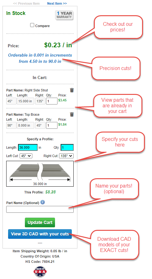 Choose from 20 different profiles ordered in your specified cut-to-length sections from a minimum of 4.500 inches [11.43 cm] to a maximum of 90 inches [228.60 cm], in 0.001-inch increments. You can specify each individual cut(s) as a standard 90-degree, 45-degree, or 135-degree cut when ordering.