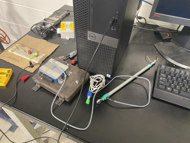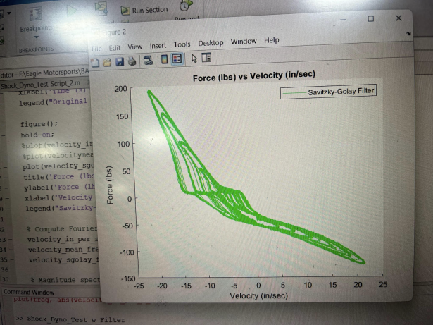 The 2019 team also used an old linear potentiometer which no longer reliably communicated data so, during development the team also leveraged their relationship with AutomationDirect for a new one. Linear potentiometers act as variable resistors. Applying a voltage to the potentiometer enables a varying voltage to be read from the middle pin based on the displacement of the shock as it oscillates up and down. This was then used in conjunction with a load cell, amplifier, National Instruments USB DAQ device, and a custom MATLAB script to record and plot the shock’s Force vs. Velocity curve to tune the Baja car. With these two items checked the team was able to run dyno tests on multiple shocks and adjust tuning to better compensate for the velocities and obstacles seen in Baja SAE competition.