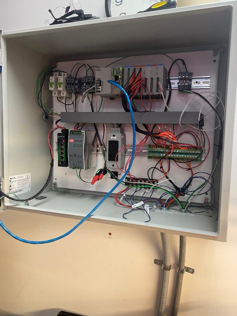 A C-more touch panel HMI was used to provide a visual user interface to the system. HMI screens were created to include a system overview, numerous drill-down screens to provide calibration for the analog devices, trending screens for oxygen and PH levels, and even a QR code screen that a user can use to access documentation of the system on a mobile device. A STRIDE 5-port industrial Ethernet switch was selected to interface the PLC to the HMI, and to put the system on the school’s internal network. The entire control system was housed in a Hammond Eclipse series wall-mount enclosure.