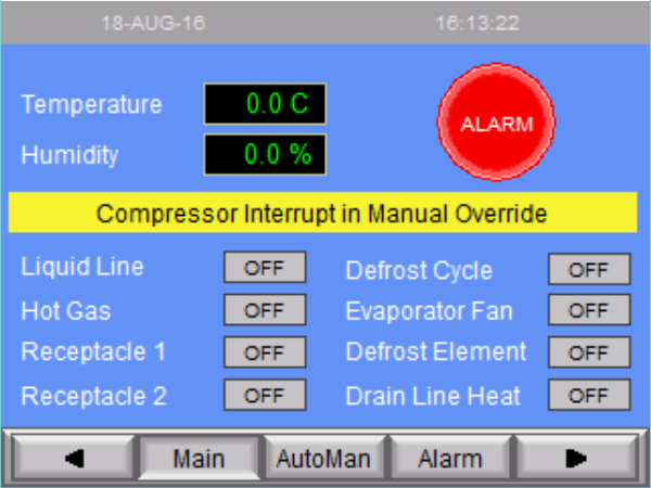 The main HMI screen displays the temperature in the room and alarm indicator (Figure 4). It also includes status indicators for the various field devices such as liquid and hot gas valves and evaporator fans, and shows whether a defrost cycle is active or not. An operator adjusts the room temperature using the HMI by entering a password-protected screen.