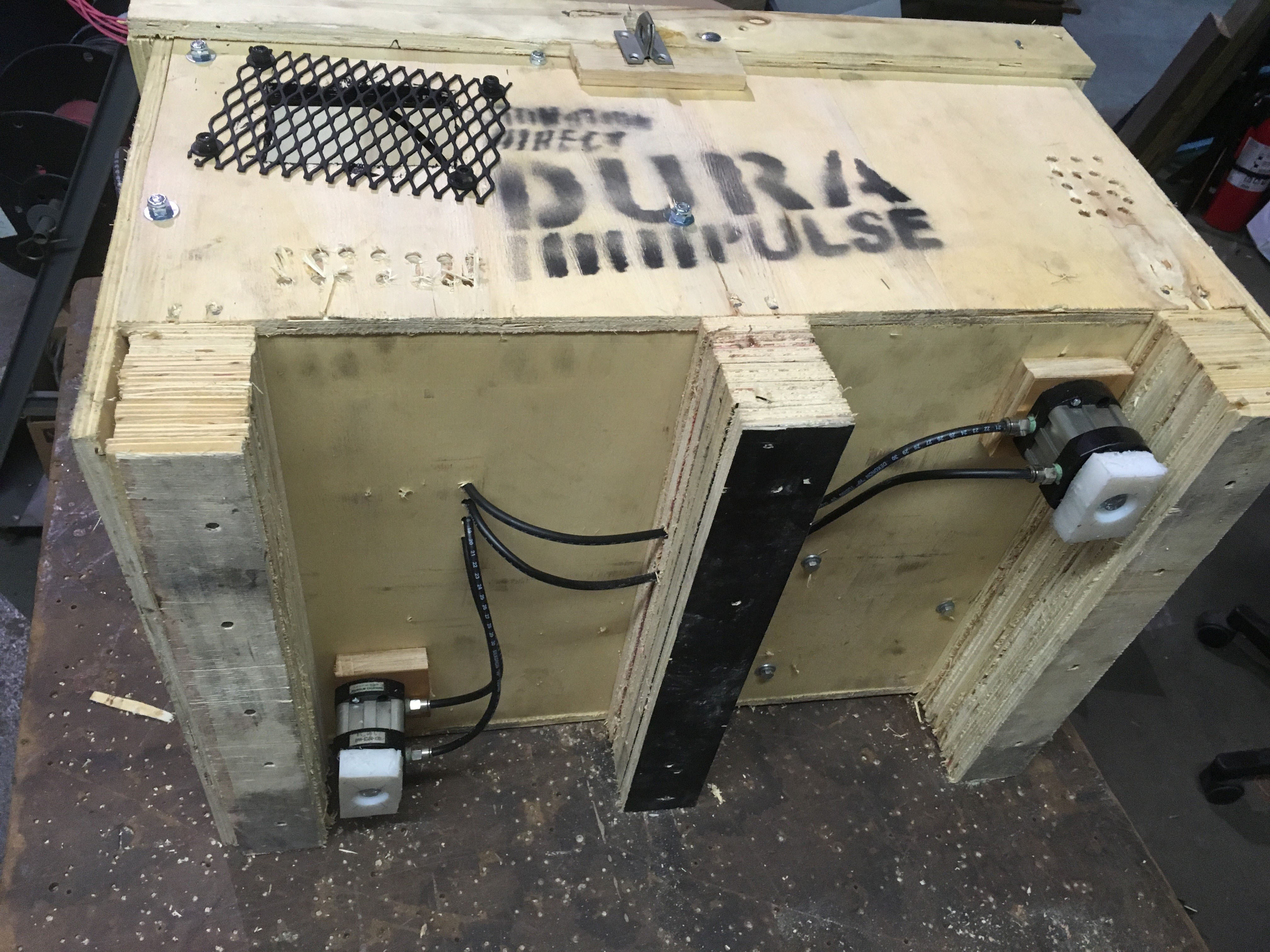 Due to my odd assortment of pneumatic cylinders, the next challenge was to figure out what I could do with what I had. A couple of squat cylinders would fit on the bottom of the box, placed between the legs at opposite corners to rock the box and make it look like there was something moving around inside.