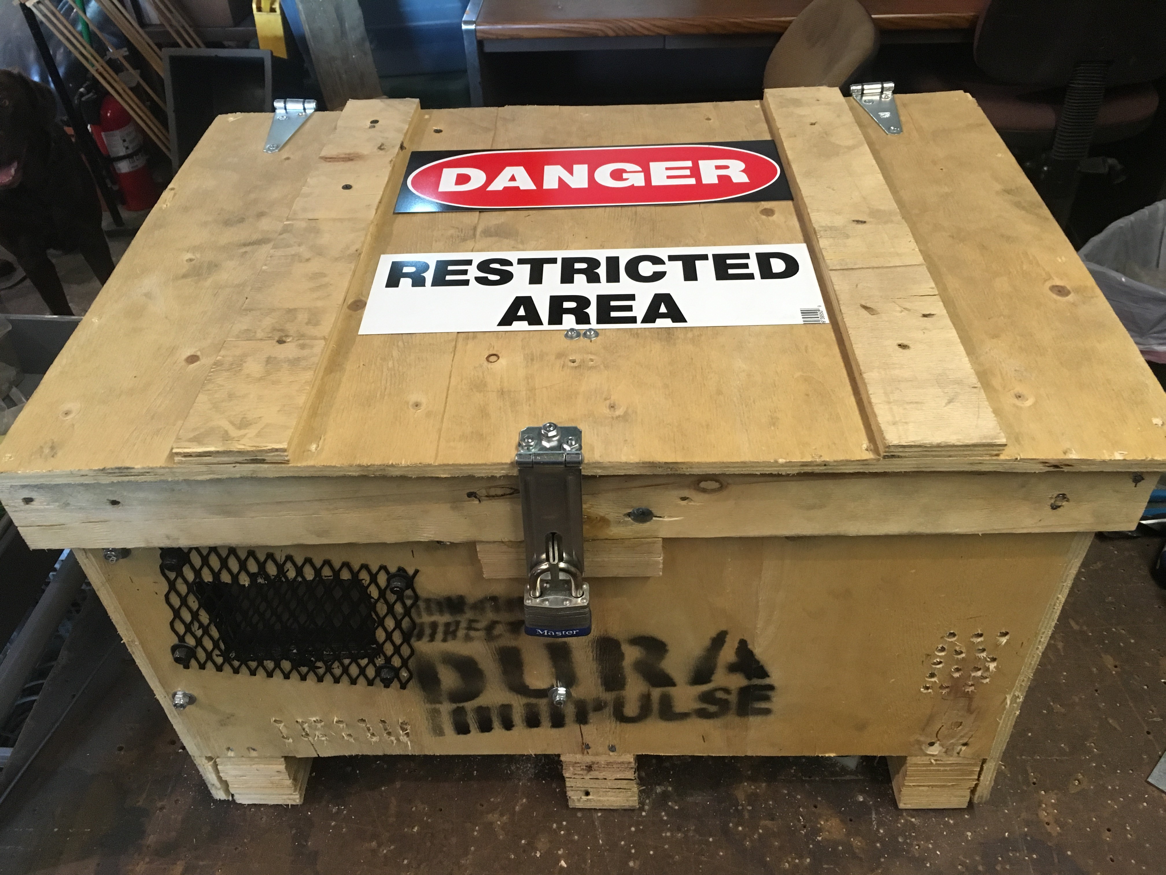 I purchased a DURApulse 60HP variable frequency drive (VFD) from AutomationDirect as a replacement for a customer’s damaged VFD. When the shipping container was delivered to my shop, I immediately knew what the wooden crate would become. This crate was just right the right size for building a Halloween Box. You may have seen similar Halloween props covered with labels, such as “Danger” or “Wild Animal”. I didn’t know at the time what the final result would be, but I could see “The Box” had potential.