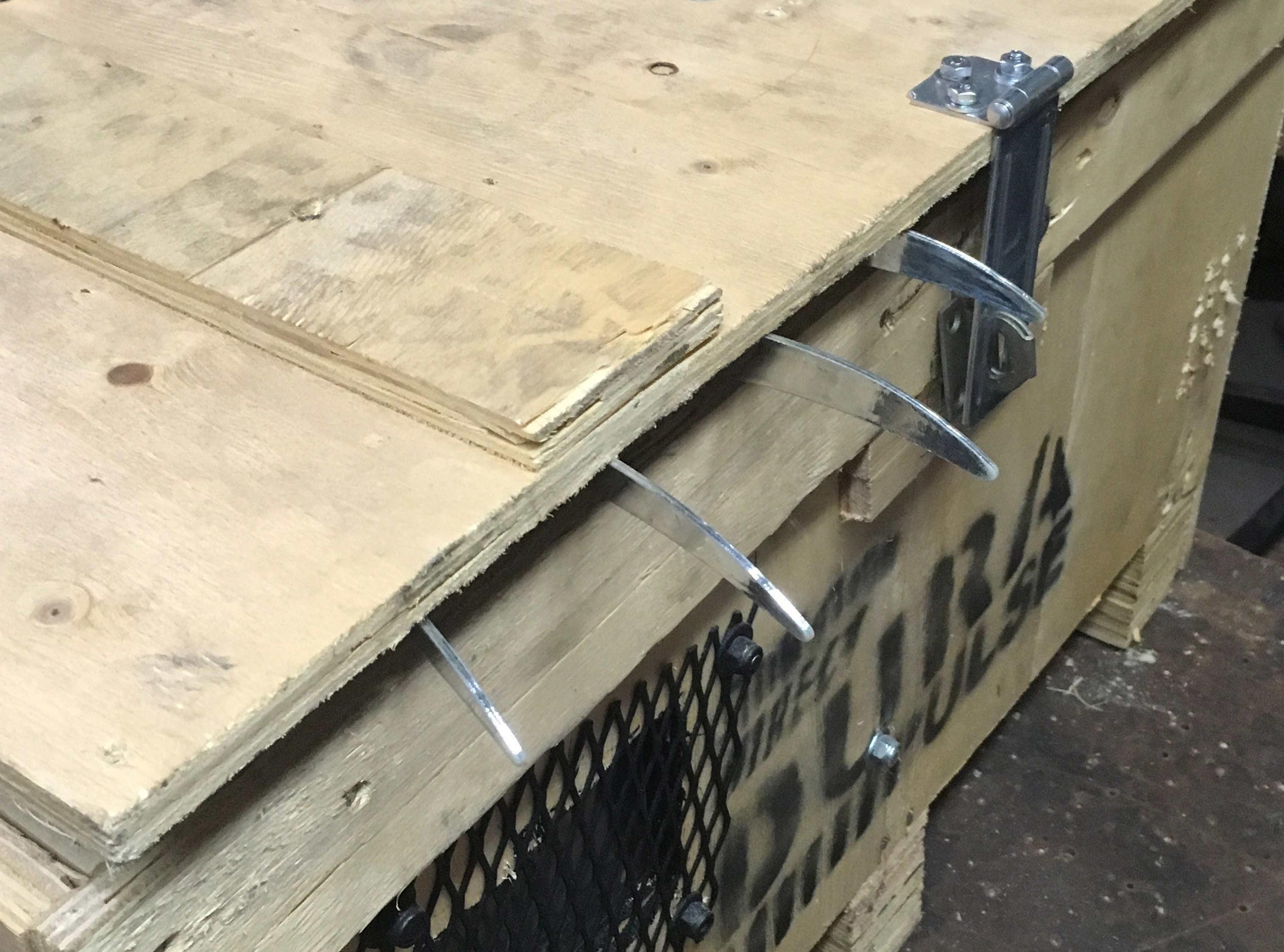 To give the impression that the ‘thing’ or ‘creature’ inside the box is trying to escape, a cylinder is used to push the lid open. With a padlock hasp connected to the lid, the staple and lock appear to hold the lid closed. What the observer doesn’t know is that the staple is installed in a slot, concealed by the hasp, and a small cylinder is used to hold it down so the lid only moves up and down a little bit.
