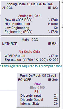 Another area of DirectSOFT that underwent major improvements is at the instruction level. There are 66 new instructions to make programming faster and easier. These new instructions, called IBoxes, are fill-in-the-blank programming blocks designed to consolidate repetitive programming routines such as configuring an analog module, creating an on delay/off delay timer, solving complex math problems, setting up a network configuration, and more. For example, to perform a calculation previously, you might have multiple math instructions like Load, Add, Subtract, Out, Pop, Divide, Outd and so on. With the new IBox instruction, you select an instruction based on the data type, specify the result location, then enter a formula just like you would using Excel® or other programming languages.