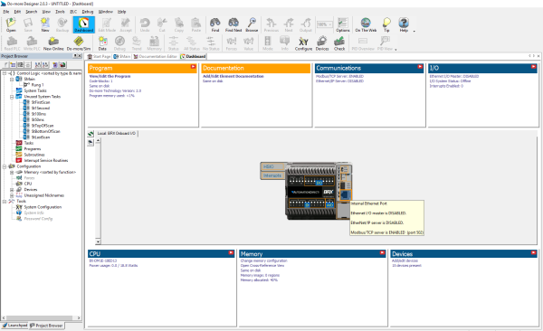 Whether a new or seasoned programmer, what’s needed are the easy to use yet powerful development capabilities provided by the Do-more Designer Software. A point and click Dashboard to simplify configuration and access to the program, documentation, communications, I/O, CPU, memory and devices is just the beginning. There are also configurable data views and trend views, along with code and PID process simulators. There are also system logs and monitoring tools, cross references and layered security features to understand and configure.