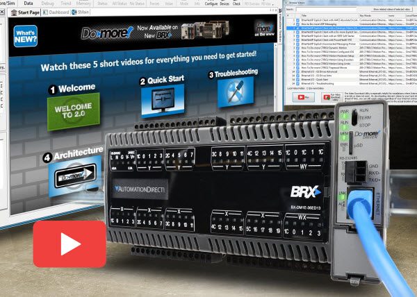 Learning how to use a powerful development environment for PLCs, such as Do-more Designer Software, may seem overwhelming. Fortunately, there are videos to illustrate. When the Do-more Designer Software is initially opened, the Start Page has five short videos depicting everything you need to get started. This includes a Welcome, Quick Start, Troubleshooting, Architecture and Helpful Hints video.