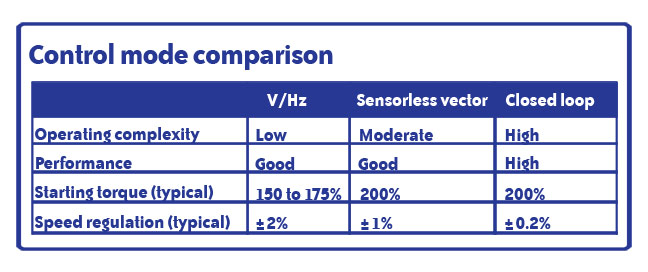 Web printing presses, paper mills, and material converting applications require the precise speed regulation of closed-loop control. For such cases, VFDs can be run in a closed-loop control mode. Elsewhere,volts-per-Hertz (V/Hz) and sensorless (or open-loop vector) modes are used.