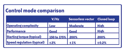 VFD control mode choice greatly depends on the application. The three VFD control modes are volts-per-Hertz (V/Hz), sensorless vector (sometimes called open-loop vector), and closed-loop.