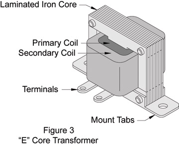Figure 3 shows a typical “E” core transformer. In this case the primary and secondary coils are placed around a common post in the center of the core. This arrangement produces a more compact unit with higher efficiencies. For these reasons, “E” core designs are the preferred pattern for control and general purpose transformers.