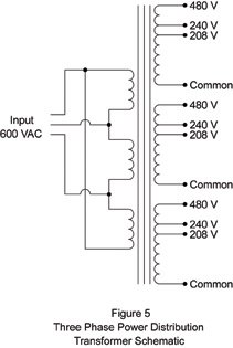 The second category for transformers is power distribution for buildings. In these cases, a high standard voltage from the grid is connected to the building and routed to a central distribution transformer. The outputs of these transformers are designed to provide nearly every standard voltage that exists in the country. Figure 5 shows a schematic representation of a three-phase distribution transformer. Notice that the transformer is an isolation design, which helps protect the building from high voltage transients and noise that may be carried on the grid.