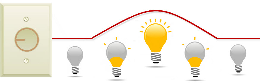 Analog signals are signals that can vary or change. We live in an analog world and our senses are analog receivers. “Feel how hot it is!”, “Can you speak up?” and “Look at all the colors!” are statements that show how the variation in analog signals like temperature, sound, and light can affect our senses. Back to the light switch example; let’s now install a little mood lighting in our home. Instead of the regular on/off switch we are going to use a dimmer switch. The dimmer switch will vary the resistance in the line, causing the light to dim or brighten as we choose. Newer dimmer switches have advanced to be more efficient but for this example we are going old school. The voltage supplied to the light will not be a constant level but a changing one set between the upper and lower limits. This is usually represented by a sine wave.