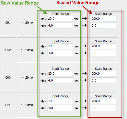 Scaling is when we take the raw voltage or current value returned and translate it into a meaningful measurement. Let’s say I have a 4-20mA flow meter that is returning an 8mA signal to the PLC. That would mean that 8mA of fluid is flowing at this time, right? Of course not. We need to take the raw value and scale it to something meaningful, let’s say gallons per minute. We know from the manufacturer that the flow meter is calibrated to read a flow of 0 to 200 gpm. Therefore, we can scale the raw value 4-20mA to equal 0-200 gpm in our system. Normally, this can be done using the programming software, as seen below, and after our value of 8mA is scaled we see that there is currently a flow of 50 gallons per minute.