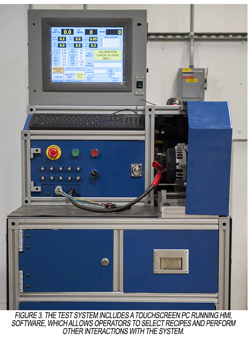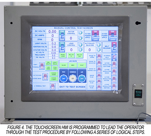 In day-to-day use, an operator has a production lot of specific alternators to test. After inserting the correct mount to affix the alternator to the test stand, the operator calls up the parameters for the specific alternator from the 3000+ alternators in the database using the touchscreen HMI. The HMI provides the appropriate test screens for the specific alternator, and the operator interacts with the HMI as required during the test procedure (Figure 4).