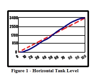 For instance, finding the number of gallons in a horizontal tank is a fairly long and complex math process that can take up a lot of scan time. It certainly isn’t a linear equation as seen in Figure 1. The dashed red line indicates a linear line and the blue line shows the actual gallons in the tank. The equation for this curve is: