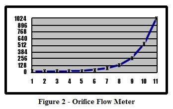 In the following example, we will be using the manufacturer’s table method, with a non-linear analog value, such as an orifice flow meter. In order to scale the non-linear signal, we need to divide the raw analog signal into sections. If we divide the raw analog value (4095) by 10, we have 11 sections, 10 of 409 units and 1 remainder of 5. We also need to divide the manufacturer’s table into engineering units by dividing into 11 sections. For this example, our engineering units will be 0, 1, 2, 4, 8, 16, 32, 64, 128, 256, 512, and 1024 (See Figure 2). This is where the numbers for the lookup table come from.