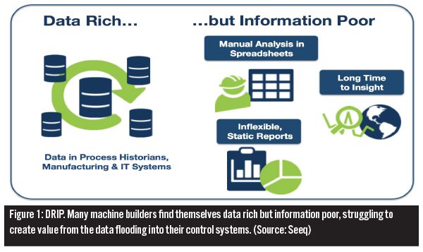 There’s lots of talk about machine learning, but can it help you improve the performance of your machines? It’s becoming easier and cheaper to gather and store data related to the operation of your machines installed at customer sites, but this creates a problem which we’ll label as Data Rich, Information Poor (Figure 1). Machine learning is being promoted as the solution, and the cover story in the May 2016 issue of Control Design magazine titled “Is machine learning smart enough to help industry?” investigates these claims by examining the experiences of machine builders and their suppliers.