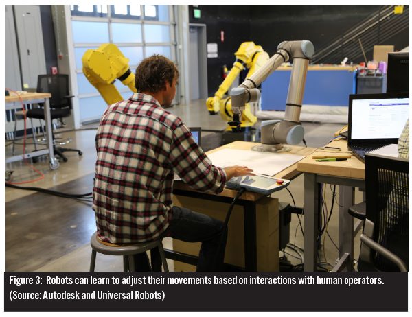 “Autodesk is experimenting with robotic systems that watch and learn from skilled craftspeople, and then work alongside these people to add precision, repeatability and/or safety to their work,” said David Thomasson, principal research engineer at Autodesk. “As the new breed of collaborative industrial robot arms, such as the Universal Robots models designed to work in close proximity to people, become more common, there is a need for more intuitive interaction with these machines (Figure 3). This is being enabled by machine-learning systems that automatically determine the best course of action based on their understanding of human preferences and abilities, along with a more complete awareness of the design and the situation in which it is to be realized.”