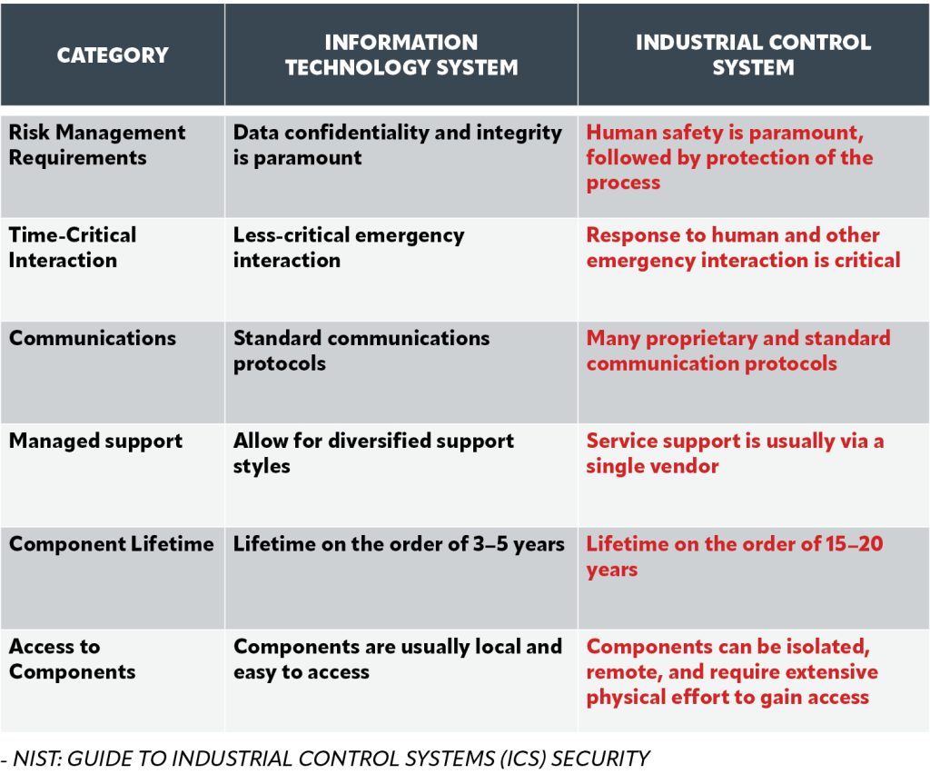 In contrast, enterprise IT networks generally operate on a best-effort basis and are primarily needed during business hours. And, unlike traditional IT systems, OT systems often operate in harsh and remote environments, rely on legacy technologies, and have long lifecycles. These factors can make it difficult to implement and maintain cybersecurity controls. As a result, the potential consequences of a security breach in an industrial setting are considerably higher than in a typical enterprise IT environment.